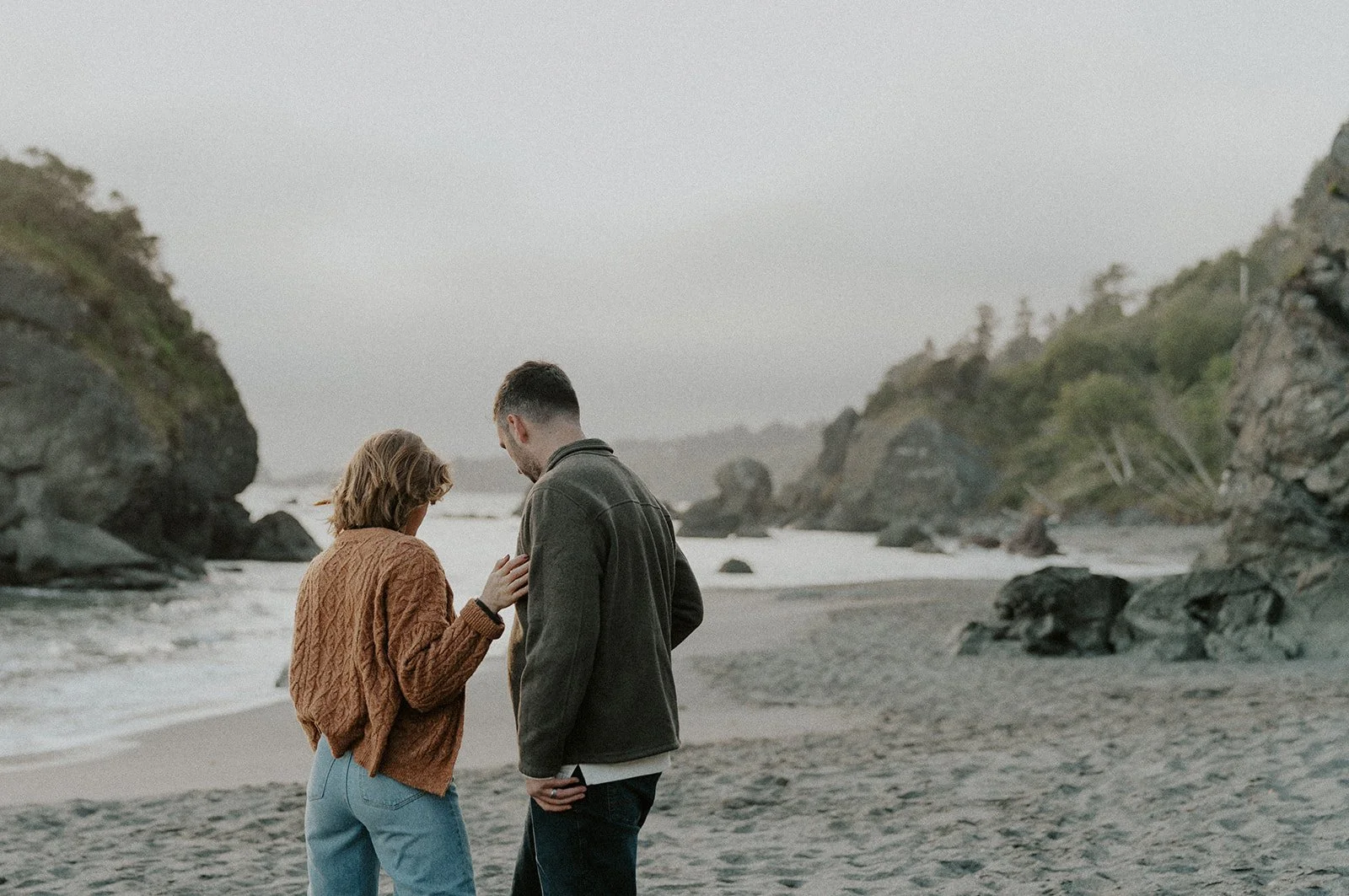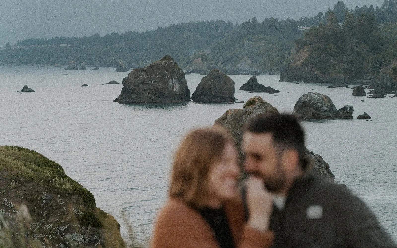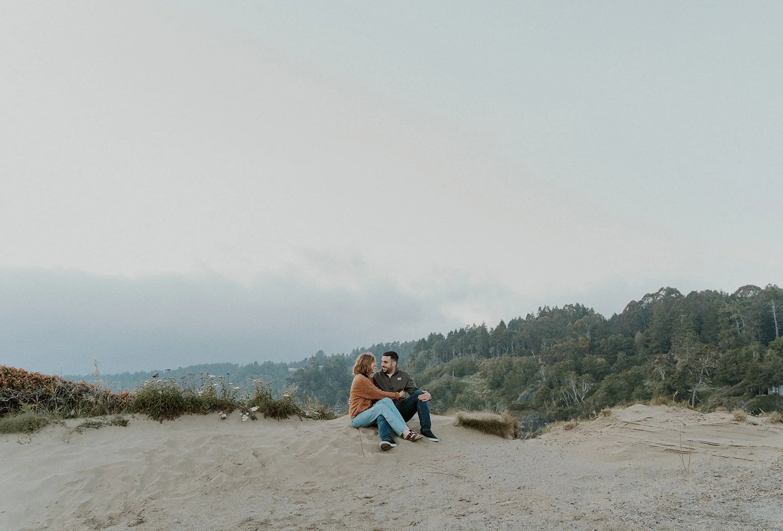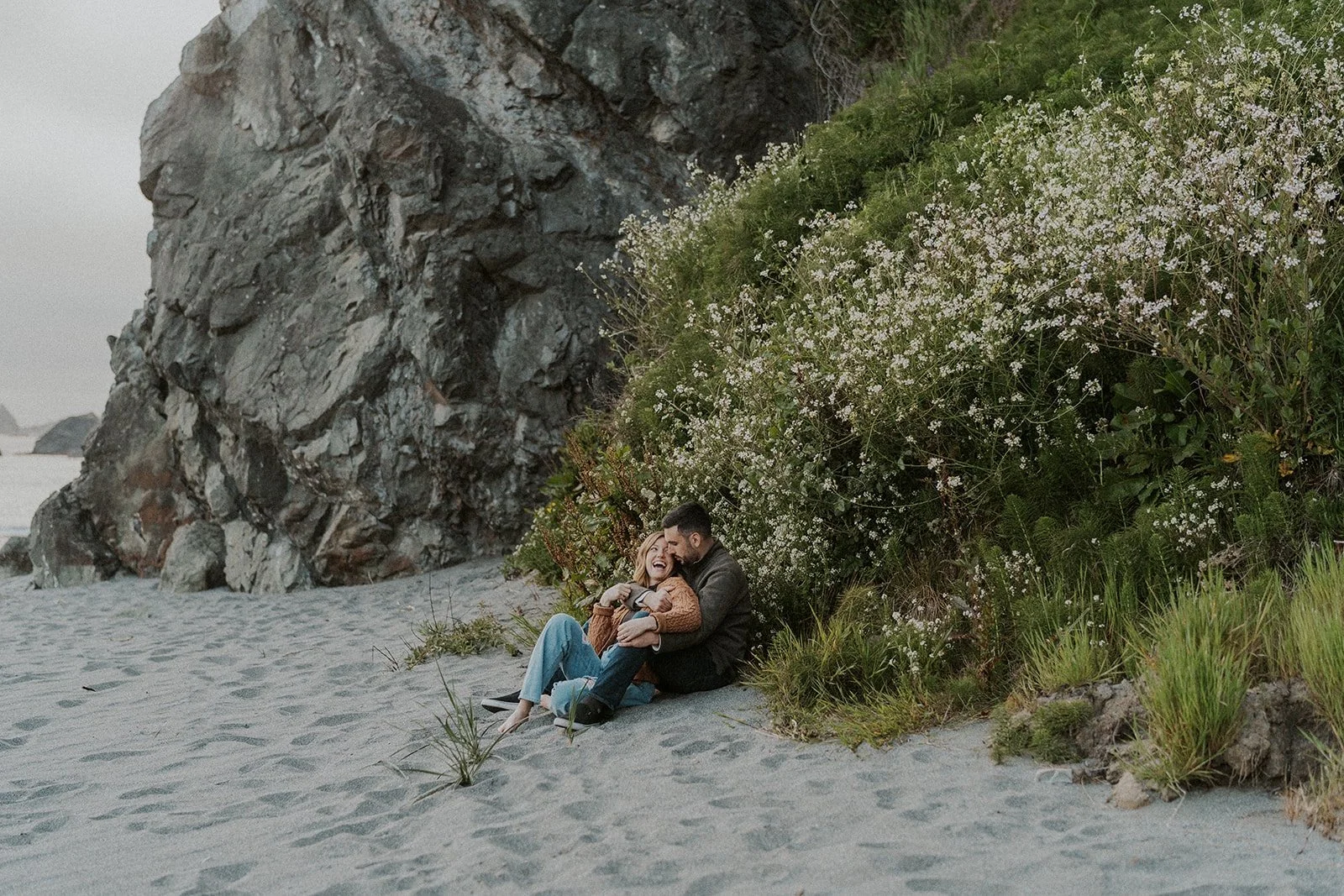 I typically look for a location that has a variety of backgrounds or settings for the shoot. In this case I was able to find forest, beach, rocky cliff sides filled with wildflowers, and coastal greenery. This provides an ample amount of different shots for the session, making the final gallery one that captures both the couple and the environment in new and creative ways.