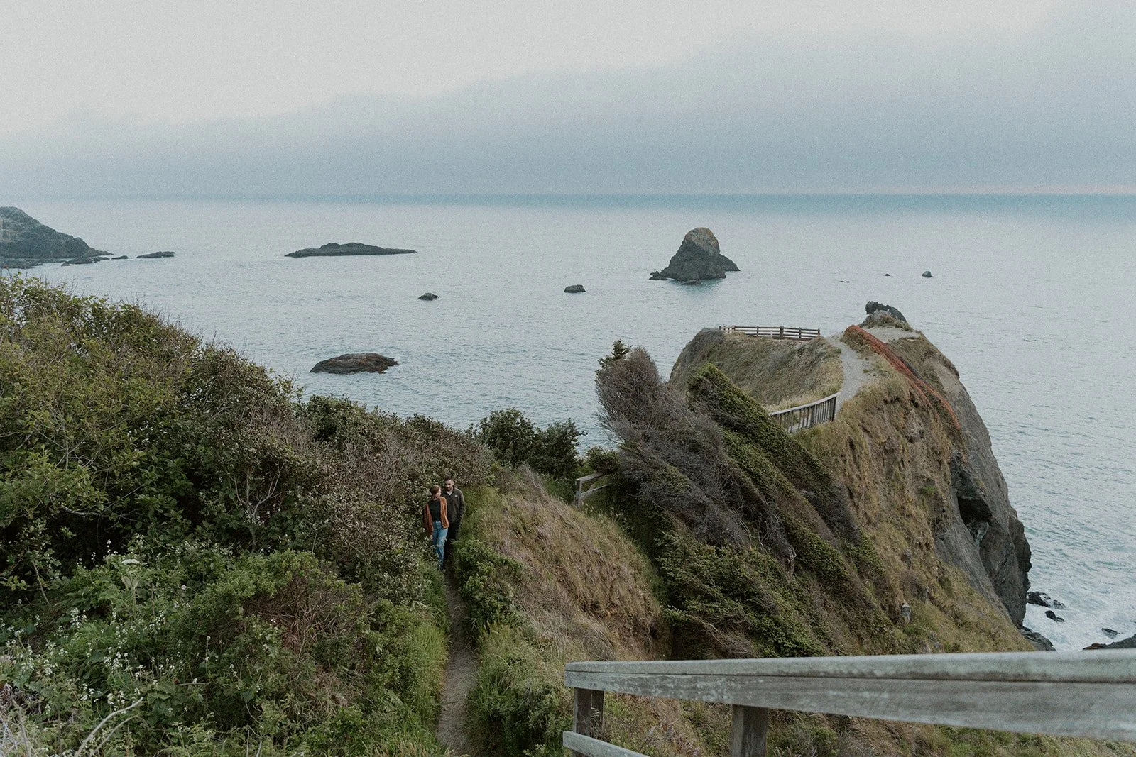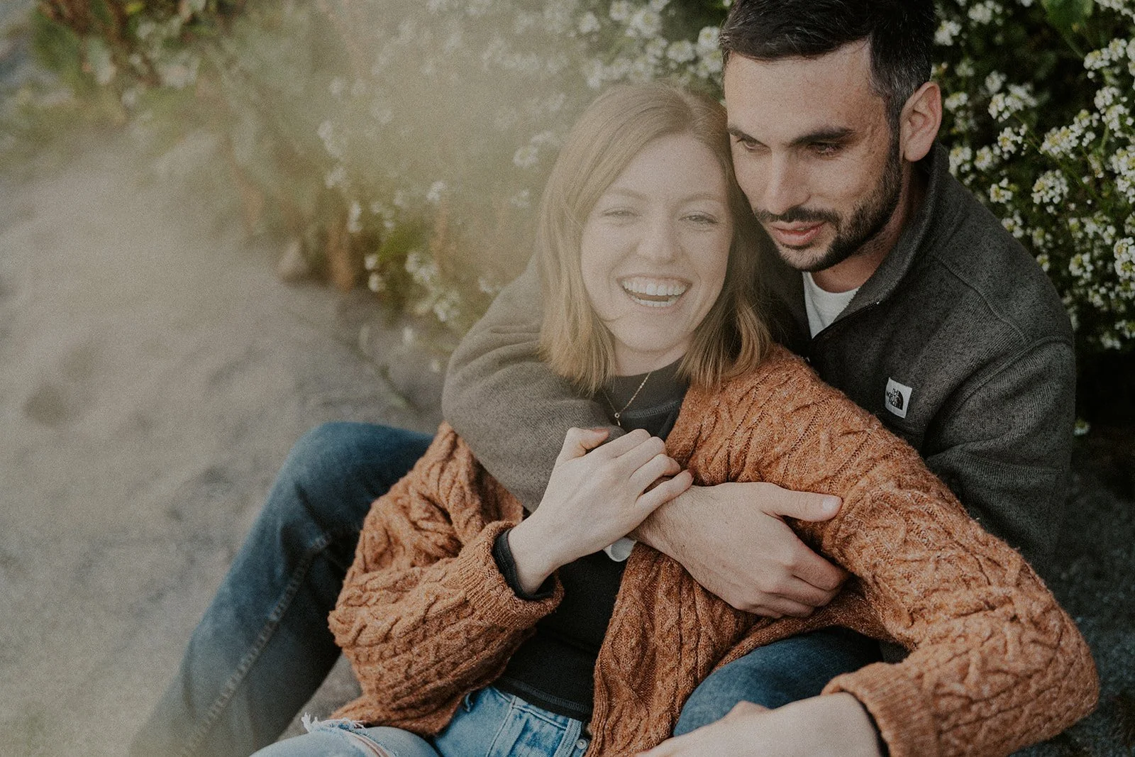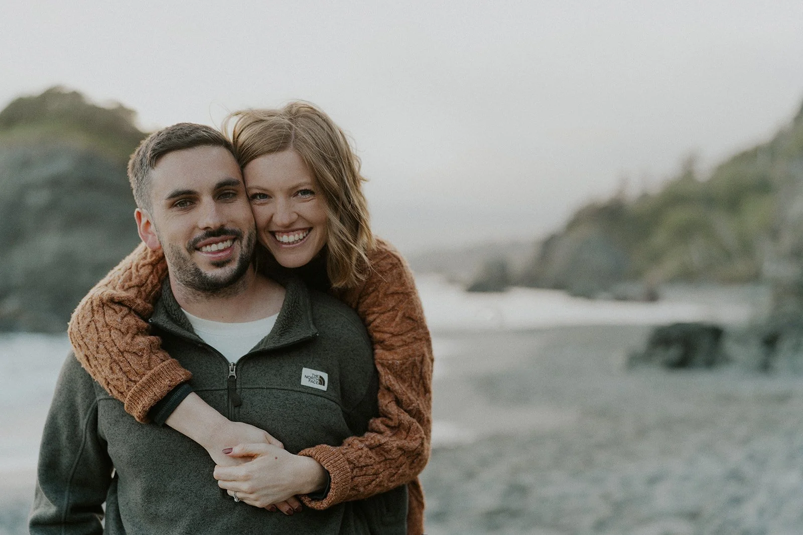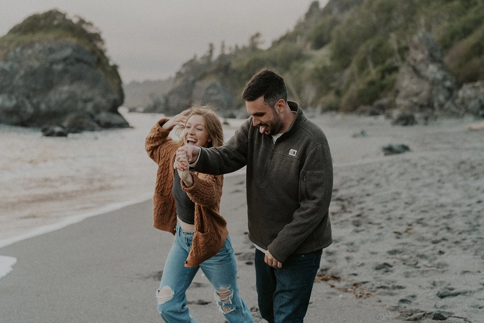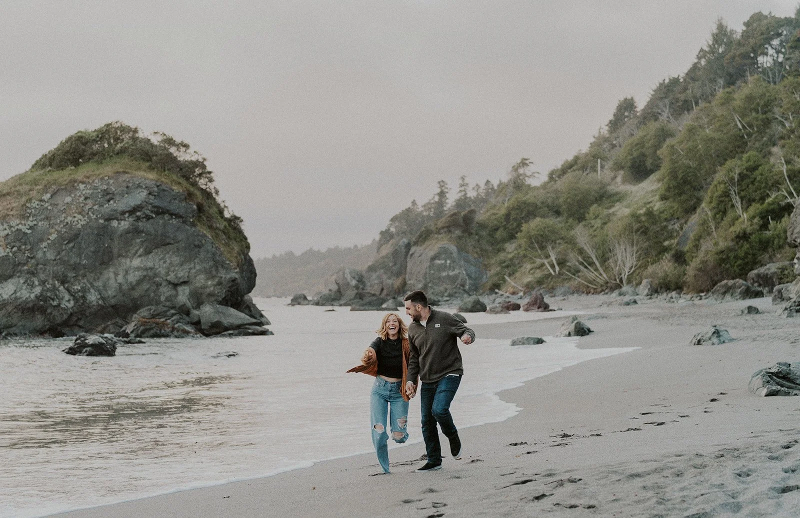I typically look for a location that has a variety of backgrounds or settings for the shoot. In this case I was able to find forest, beach, rocky cliff sides filled with wildflowers, and coastal greenery. This provides an ample amount of different shots for the session, making the final gallery one that captures both the couple and the environment in new and creative ways.