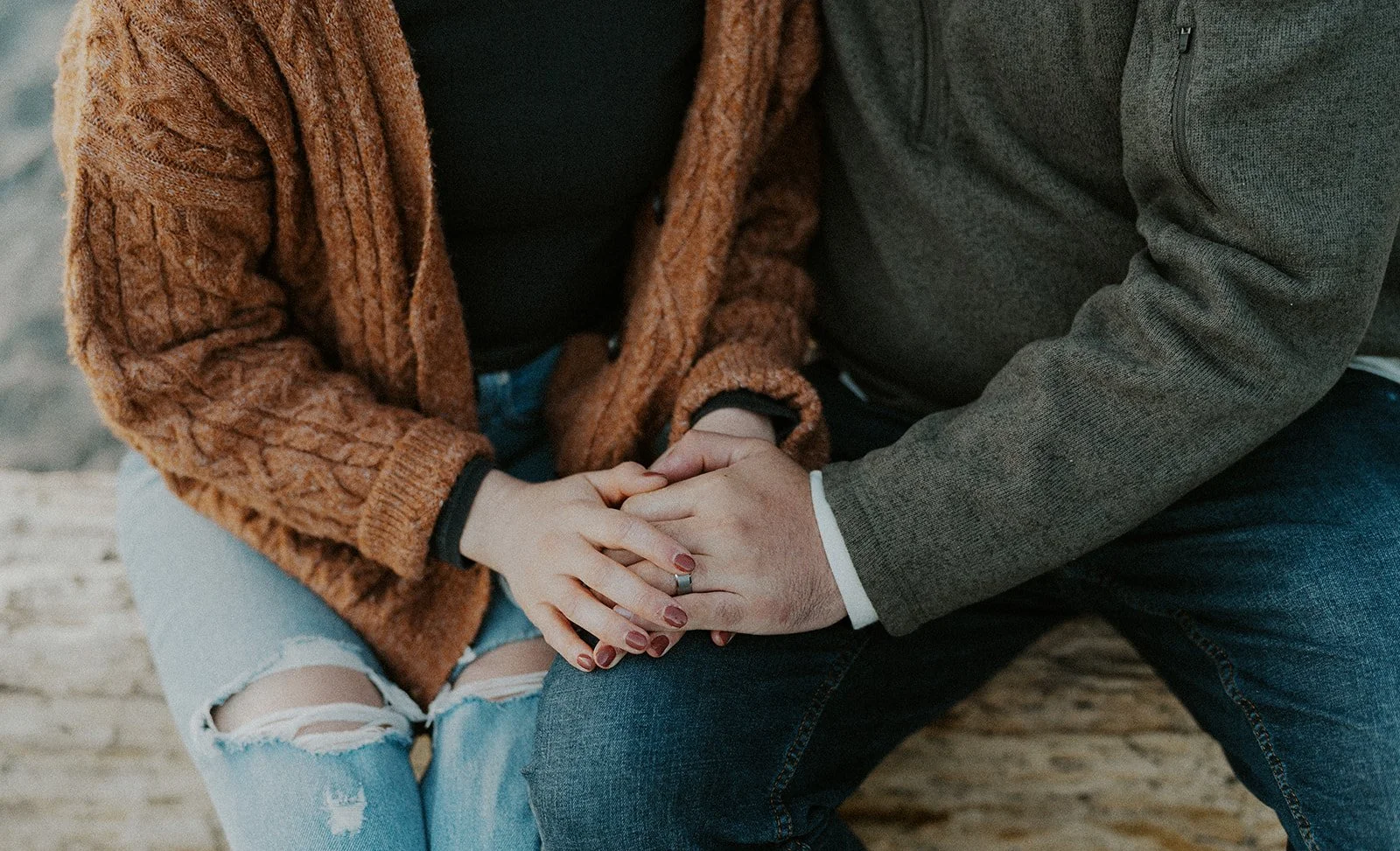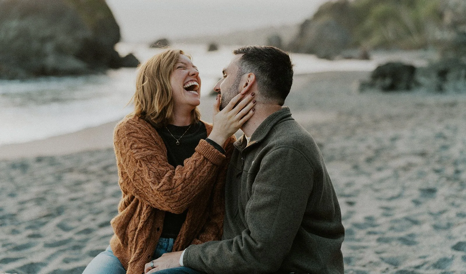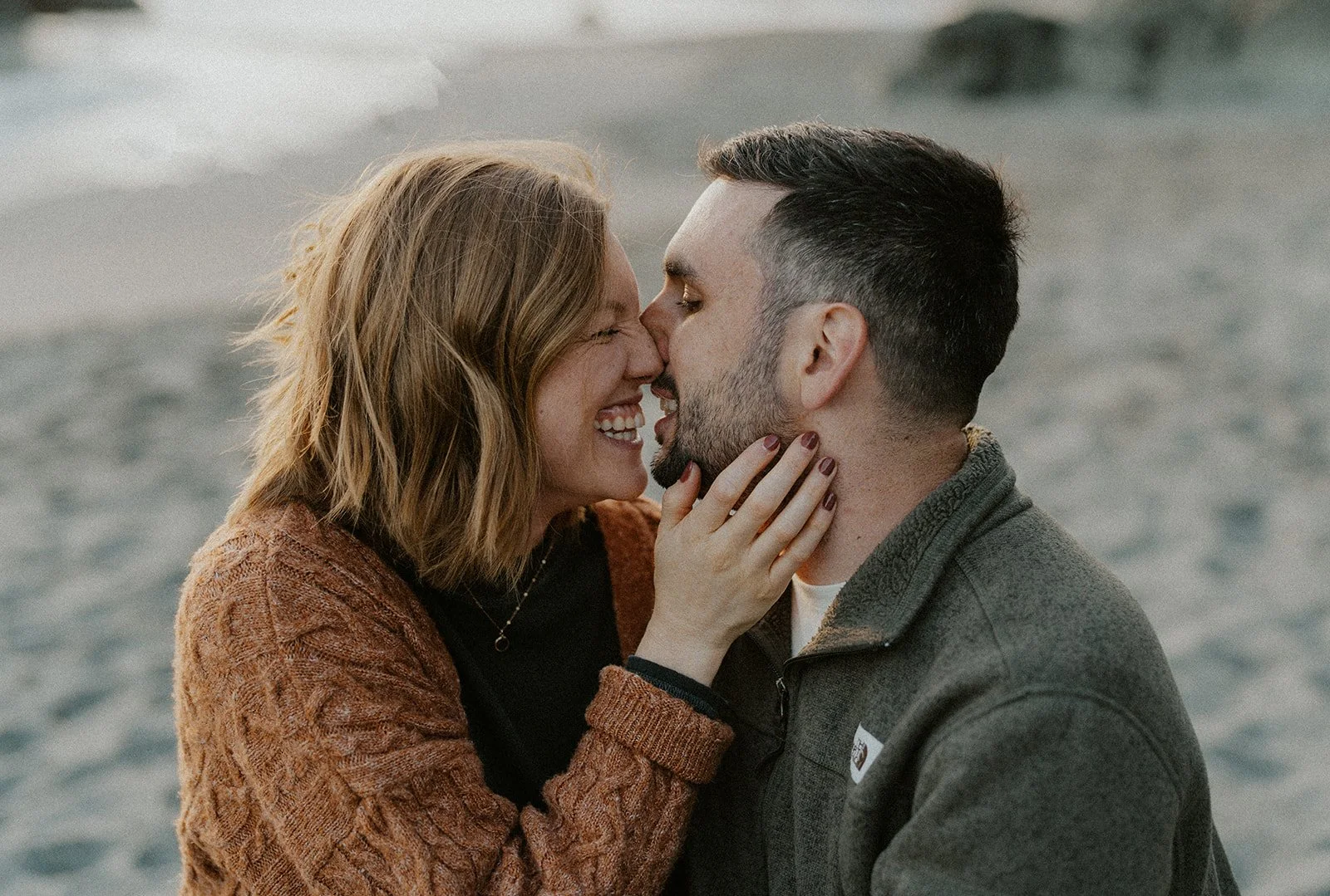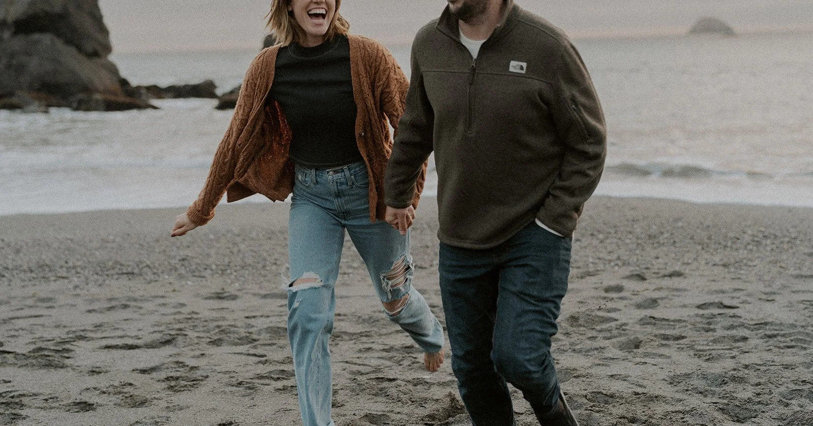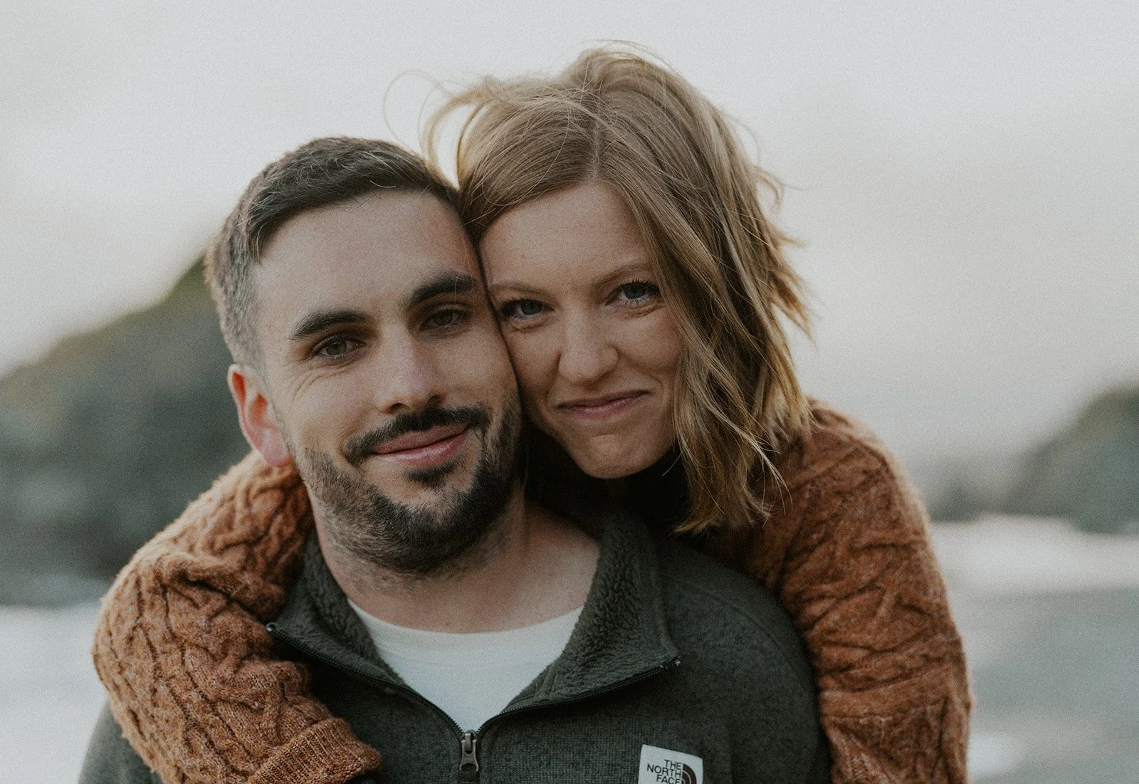 Earthy warm tones always make a calm and warm contrast to the cool colored background of the coast : An orange sweater for her and dark sweater for him to contrast the brightness of the sky, water, and sand